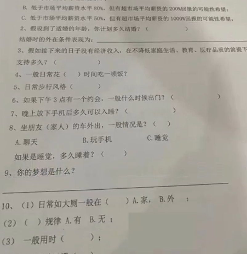 据@正观视频报道,这家公司一共设置了15道题,包含哲学、数学、日常生活等方面。其中提到了吃饭时长、入睡时间、如厕习惯等问题,甚至详细到“日常如大厕一般在家还是在外、有无规律、用时多久”等涉及个人隐私的内容。