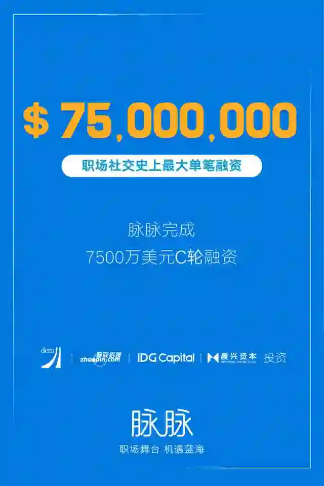 11月15日,实名制职场社交平台「脉脉」向创业邦透露,目前已经完成C轮7500万美元融资。本轮融资由DCM领投,IDG资本、晨兴资本继续跟投,同时还引入了智联招聘作为战略投资方。