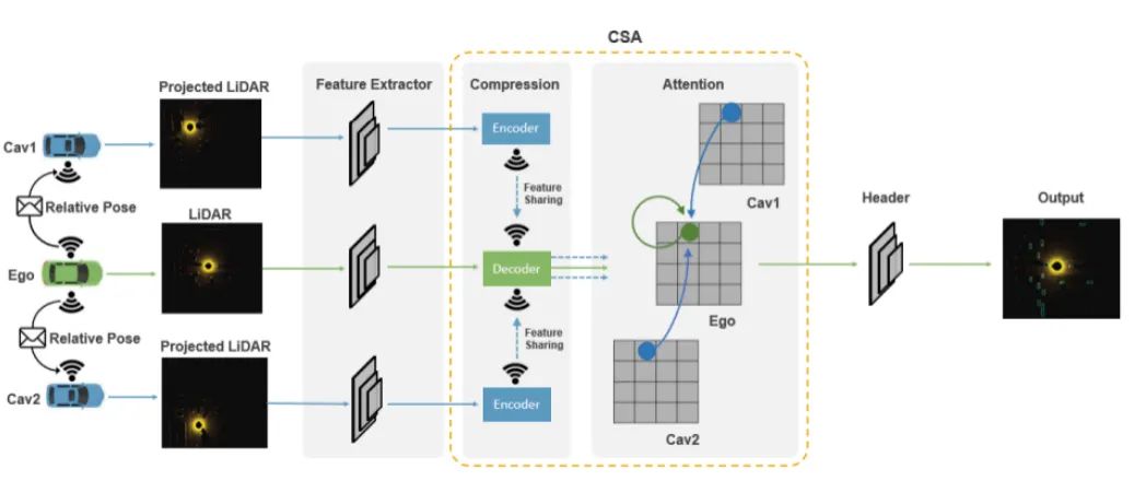 而四种融合方式有:1)单车无融合(基准线); 2)点云融合,即每辆汽车传送最原始的点云给对方; 3)结果融合(后融合),即每辆汽车单独检测,将自己的检测结果包括检测框位置与置信度传给其他汽车; 4)中间层融合,如下图所示,每辆汽车先将自己的点云投射到ego汽车的坐标系下,预处理点云后用3D点云网络提取深度学习特征,这些高维的特征经过压缩以后传到ego汽车上,然后使用注意力机制来进行点对点的多车空间维度上的融合,最后得到检测结果。该文章认为中间层融合是最优方案,因为点云融合要求带宽较高,速率较慢,结果融合并不能最大限度地结合信息,而中间层融合由于深度学习特征对压缩的鲁棒性,可以同时克服另外方案的缺点。