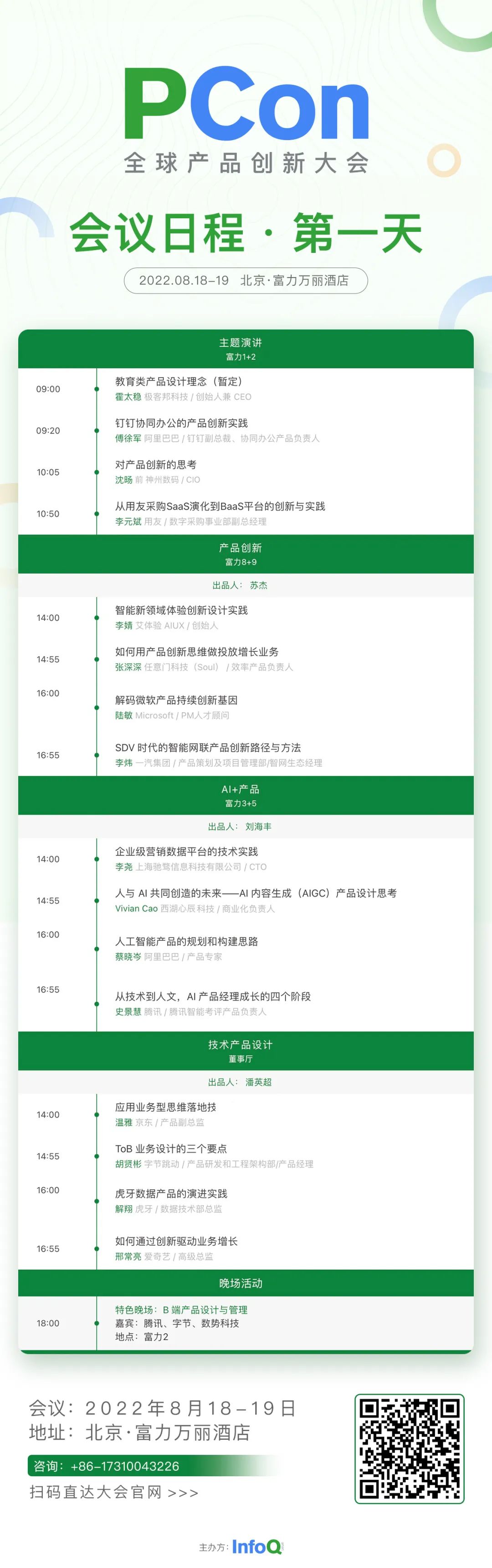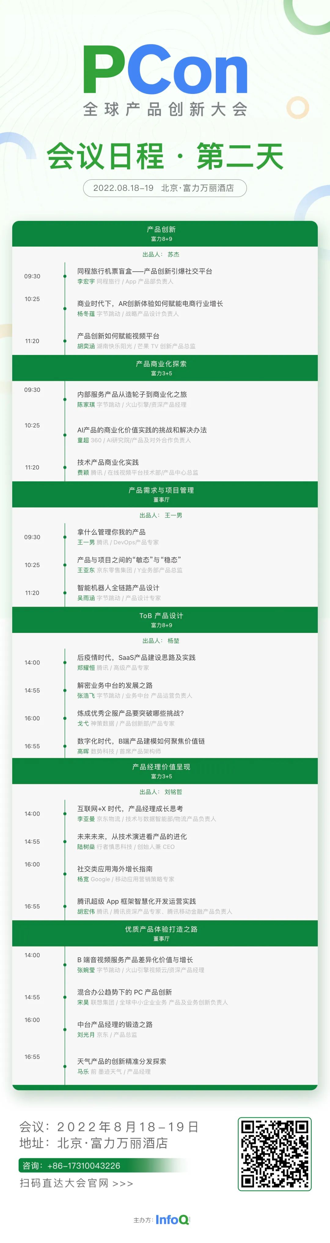 本次大会的 9 个产品专场分别以【产品创新】【AI+ 创新】【技术产品设计】【产品需求与项目管理】【产品商业化探索】【ToB 产品设计】【产品经理价值呈现】【经典产品案例】等主题展开分享。具体分享内容,可通过下方海报扫码或点击底部【阅读原文】查看大会全部日程,期待与你现场交流。