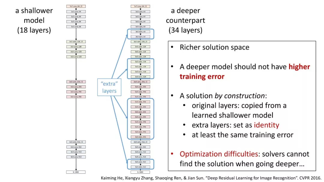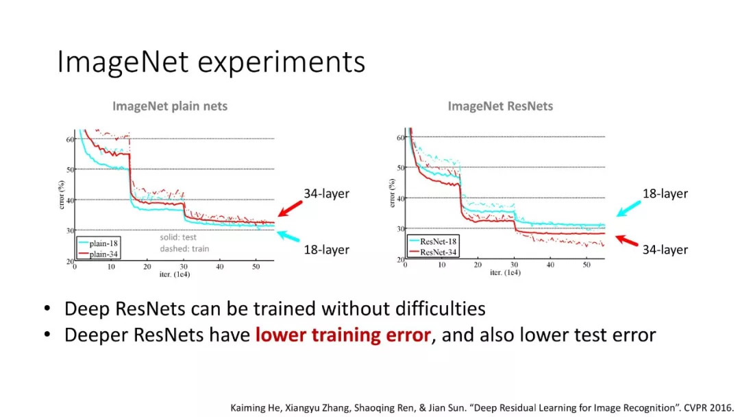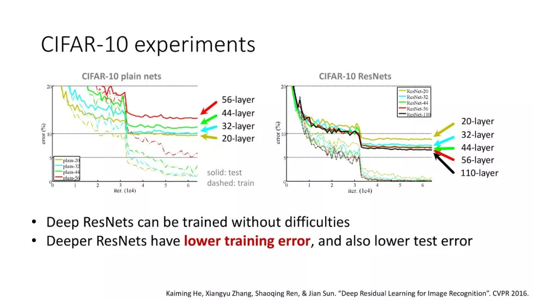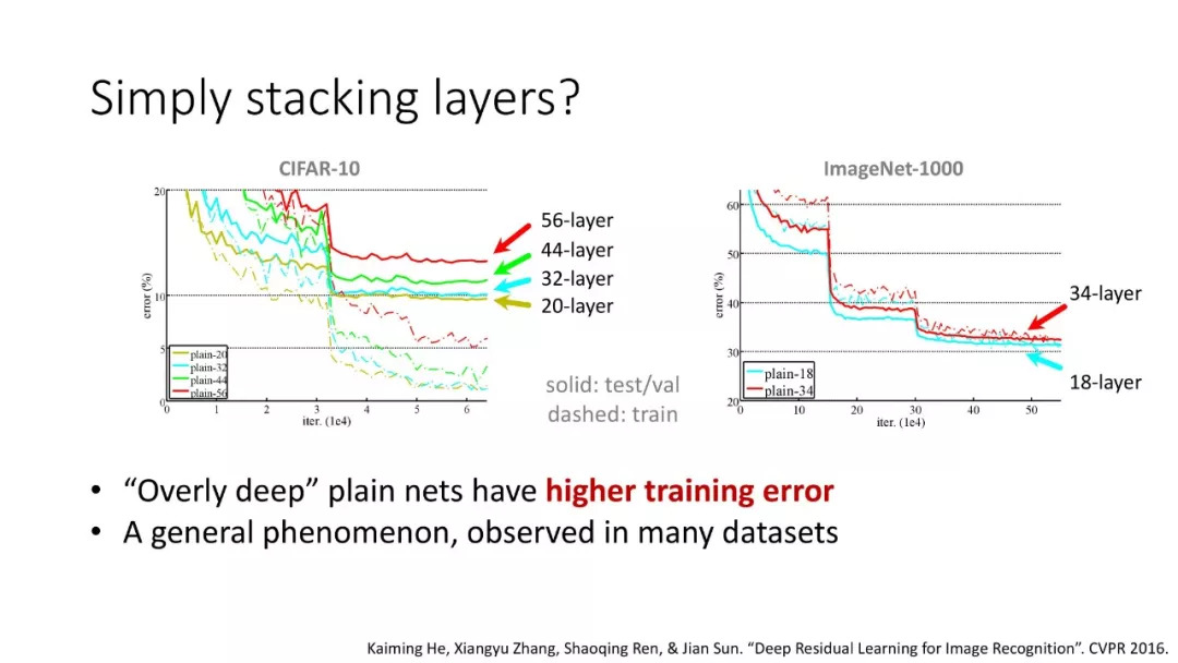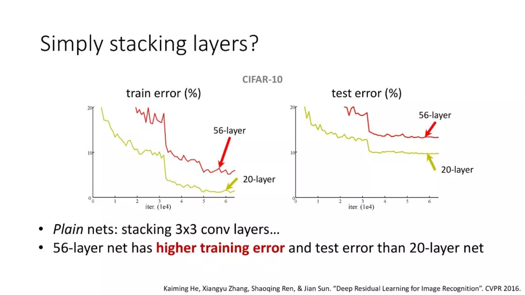 简单地堆叠层的网络(Plain nets)堆叠3x3的卷积层,堆到56层的时候比20层的时候训练误差和测试误差都更高。