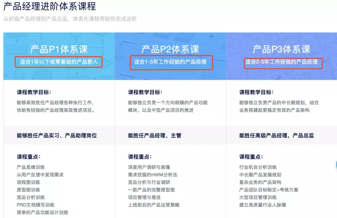 如果说可汗学院是按照用户真实年龄层进行划分,进而匹配相应课程,那么三节课就是依据互联网工作年龄作为划分标准,为用户提供相应阶段的课程服务。以三节课产品学院的课程为例,主要分为P1,P2,P3这三大体系课,分别对应互联网初阶,中阶及高阶人群,除此之外,还会有策略产品、数据应用等专项能力课程。