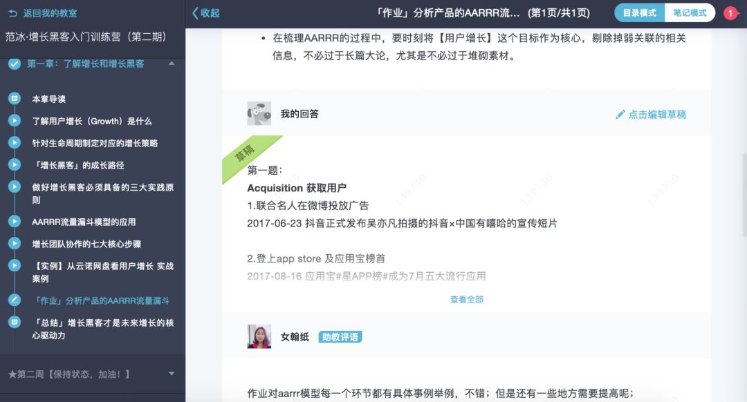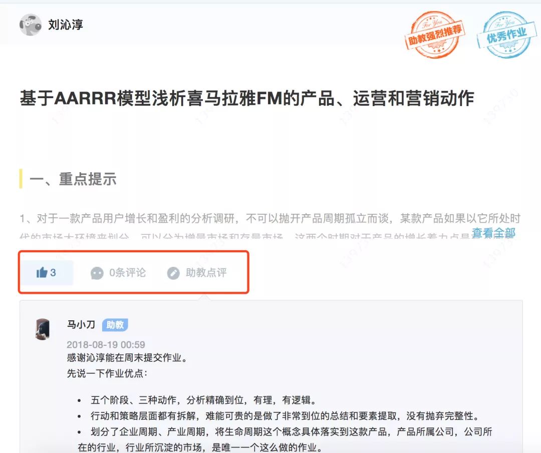 同样,我们可以看一下三节课的课程练习模式。不同于可汗学院的“点块攻克”练习,三节课需要你学完一章内容后,再整体完成作业。用户提交作业后,会有“助教”这个角色去人工审核你的回答,并给予你答案中存在的问题提出客观建议,让你再次迭代作业,而优秀作业会得到置顶位置展示,供其他人参考。