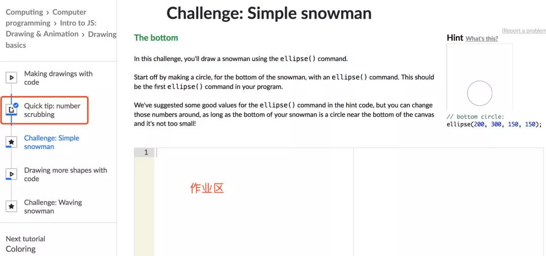 以可汗学院编程课为例,在结束视频后,下一个快速提示会对视频课程进行简单的动图和文字说明,用以辅助你去做接下来的训练挑战。那么第三个🌟标就是你的作业——用编程画出一个雪人。而下方空白区域就是作业区,此外作业区底部还会有一些代码和图形对应的提示说明。抵交作业后系统会自行批改,如果识别出错误答案,就会有提示引导你再看一遍相关知识重新答题,或者给出解题思路说明。