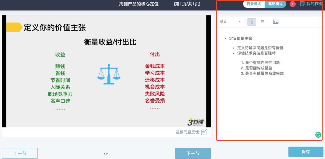 虽然三节课没有对应进度条的Transcript摘要说明,但是用户却可以切换到笔记模式,进而可以边看课程边做简单地记录和摘要,方便回忆该视频内容及提炼重点信息。