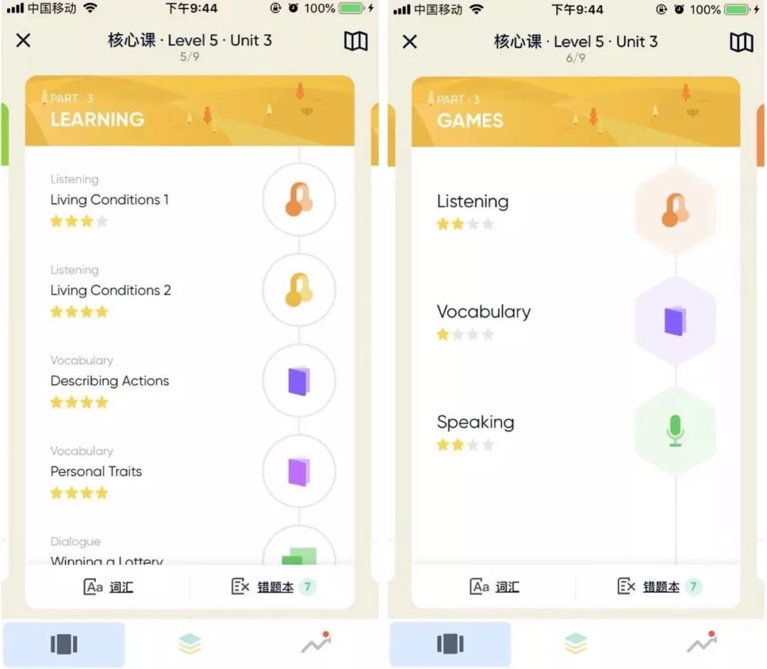 完成一个课时要累计到足够的星星,才能通往下一关;完成规定的学习时间会有奖励。在每个小单元的后面,课程都以游戏形式开展。主动跟读的频率和正确率越高,课时的分数也会越高。