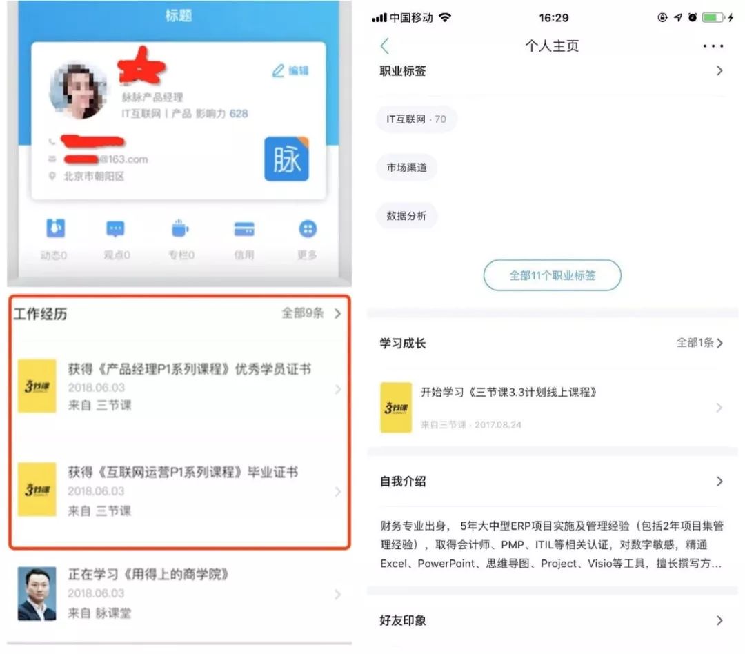 从去年底开始,三节课与脉脉App(一款职场社交软件)已经打通,在三节课接受过的培训等信息都可以直接同步显示到脉脉的个人名片主页上,完成作业后会有“毕业证书”发放,如作业完成度和质量高,三节课还会给予学员颁发“优秀学员”称号,成为职场技能背书。