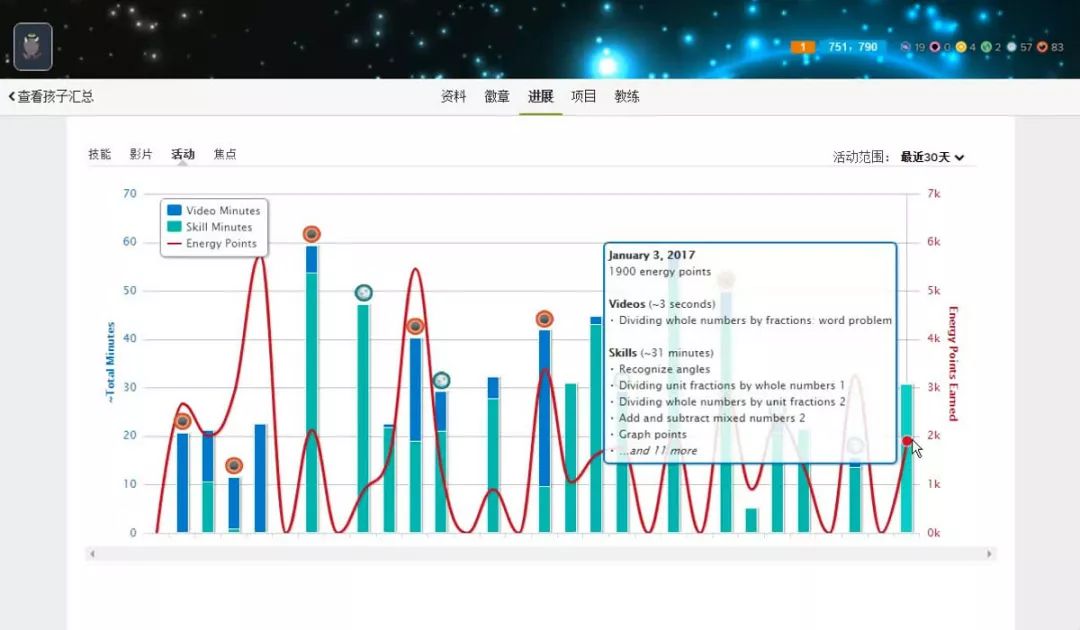 先说可汗学院,它设计了一个叫“能量分” 的东西。“能量分”(Energy Points),是可汗学院最主要的一个指标。红色曲线就是每天得到的能量分(例如鼠标指向最右侧时弹出的方框里显示:1月3日得了1900分)。