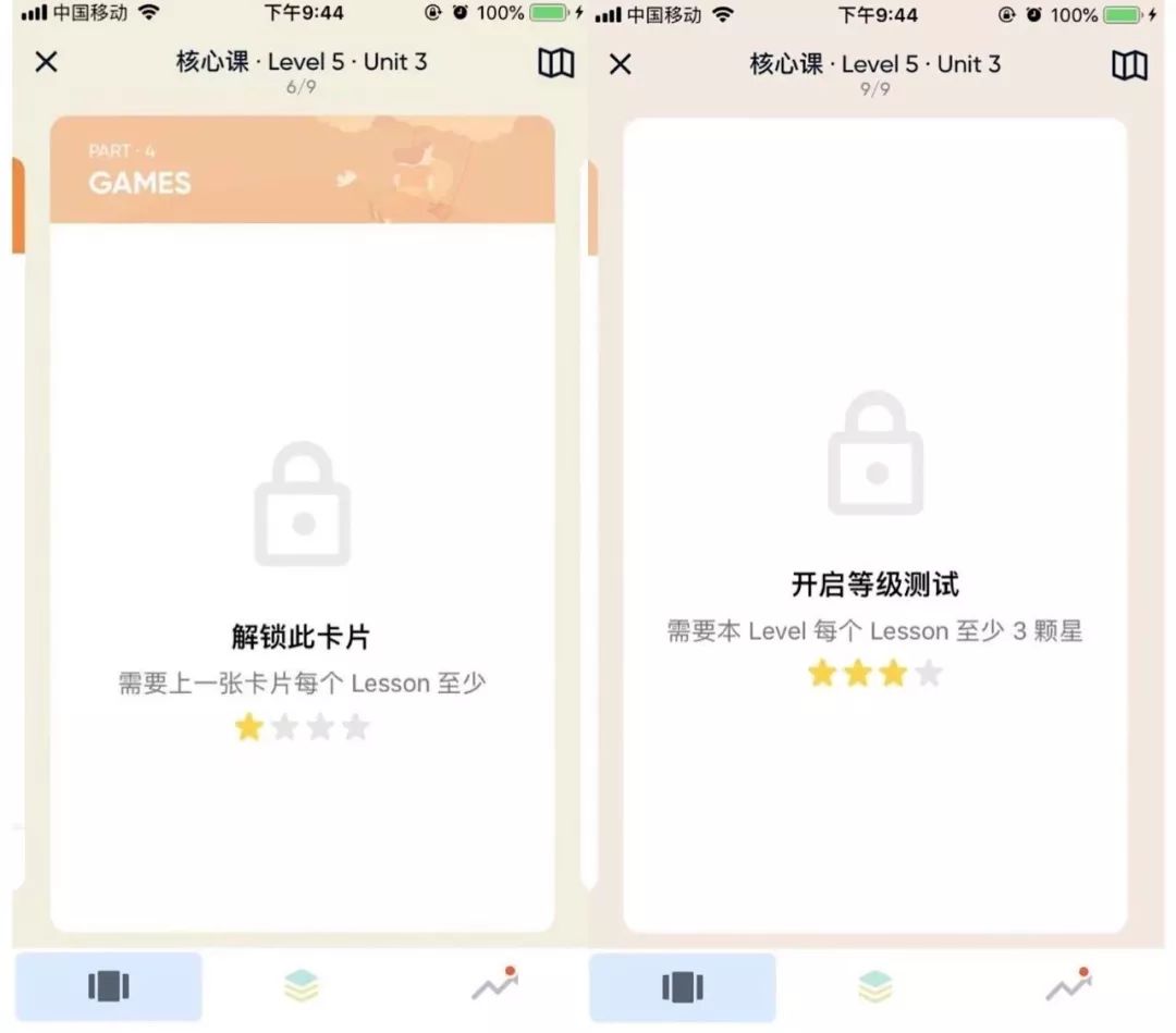 这种卡片设置较好的量化了每天的学习内容,而当前课程的学习效果会影响后面的学习的进程,只有前一张卡片满足相应的学习效果,后一张的卡片才会解锁相应的课程。可以说很好的控制了学习的质量。