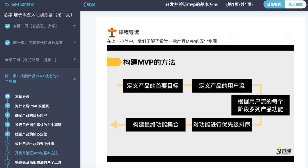 以我学过的《增长黑客入门课程》为例,三节课官网的课程设计交互逻辑同样是采用了一个个模块化的视频课程,让用户可以根据目录内容,循序渐进的掌握并了解相关岗位知识和概念。