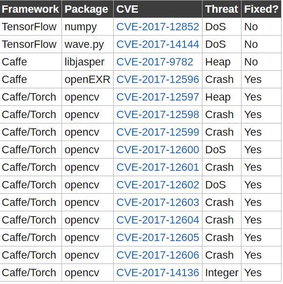 上述研究人员在分析了 TensorFlow,Caffe,Torch 这三大深度学习框架所使用的大量第三方开源基础库后,发现它们存在不少的网络安全漏洞,容易受到拒绝服务攻击、逃逸攻击、系统损害攻击的影响。