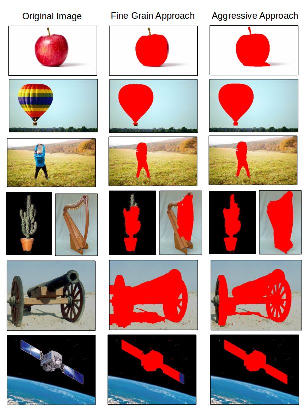 据观察,细粒度显著性方法常常会生成碎片区域。在包围框生成后,其他任何落在包围框里的不属于最大区域的白色部分都会被添加到包围框里。包围框的边界会增大来包围这些区域。Aggressive显著性方法并不需要这样做。通常最大区域的包含量超过了预期。