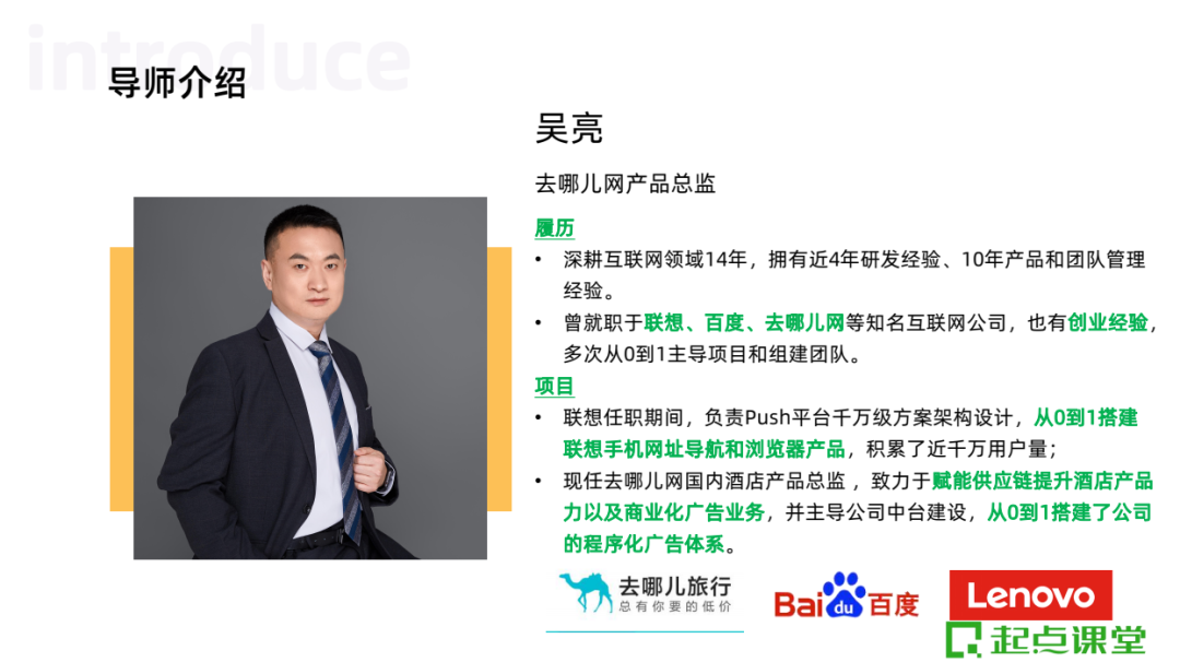 本次特别邀请了去哪儿网产品总监@吴亮 直播授课;深耕互联网领域14年,拥有近4年研发经验、10年产品和团队管理经验。