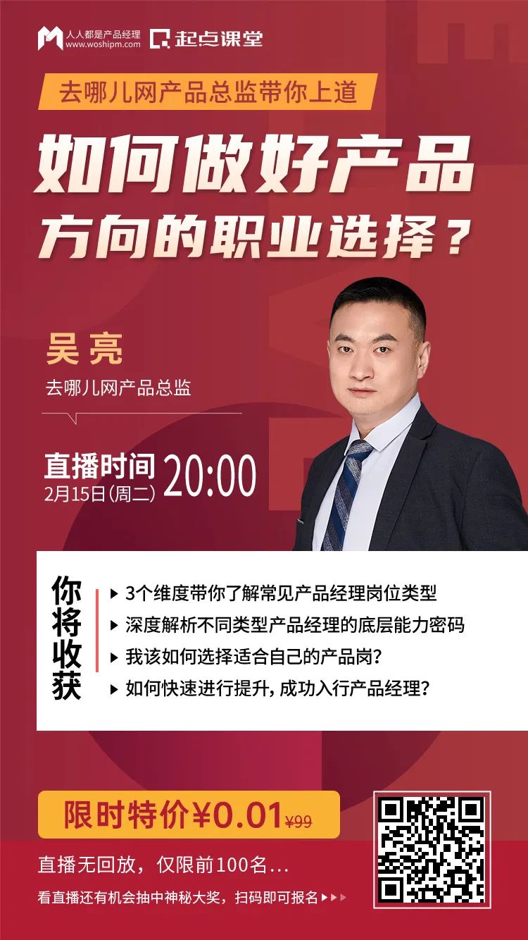 为此,我们特邀拥有10年产品和团队管理经验,去哪儿网产品总监@吴亮老师,在2月15日(周二)晚上20:00,为大家揭开谜团!