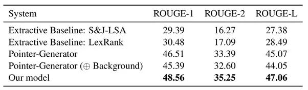 研究者们将新模型与S&J-LSA、LexRank、Pointer-Generator等基准模型作了对比。结果显示,研究提出的新模型显著优于其他模型算法。比对模型的详细信息参见原论文。