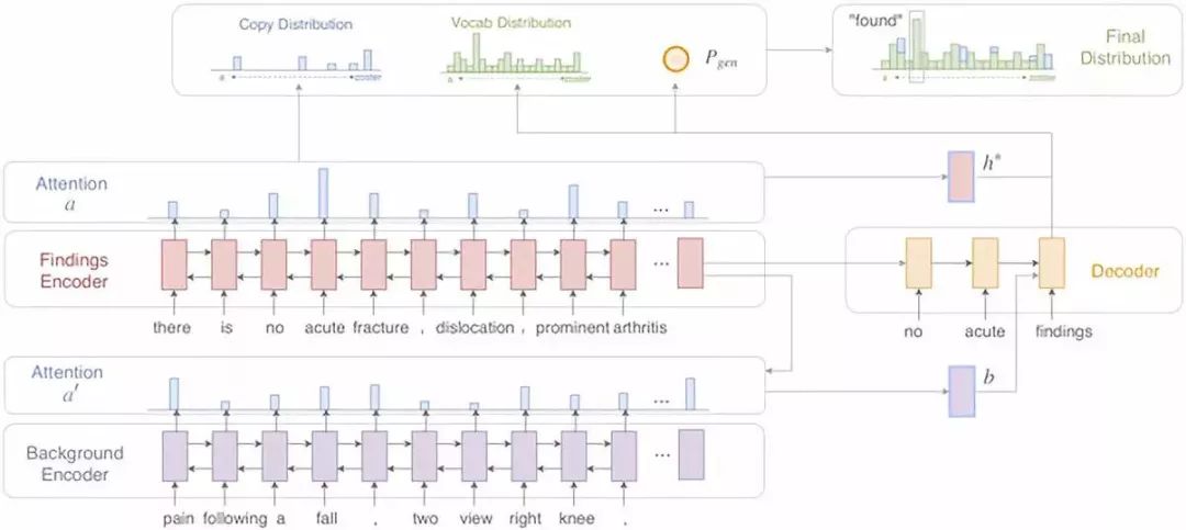 这一模型同时具备“复制-黏贴”功能。在解码器生成诊断报告的过程中,可以选择生成词库中的合适词汇,或者直接从病情记录中“复制-黏贴”相关文字。
