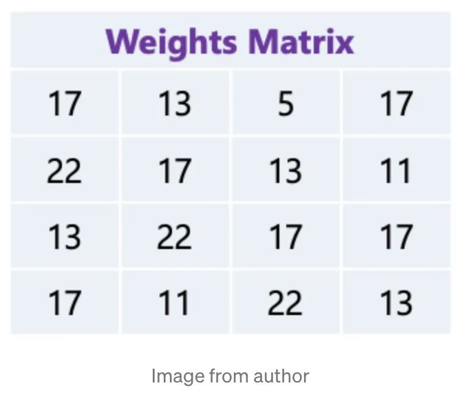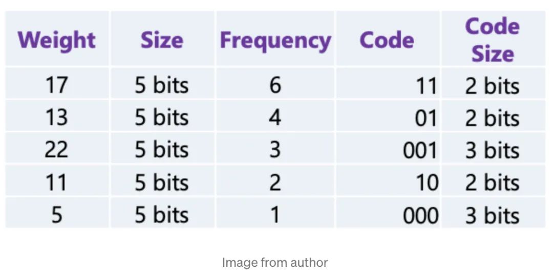 通过使用霍夫曼编码对模型进行压缩,使用01编码 weights,把最常出现的权重用较少的 bit 去编码,如下图所示,我们有已经被量化的权重矩阵: