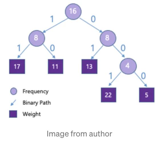 每个权重占5bit(0~31),如果使用霍夫曼编码,我们就会得到下面这颗树: