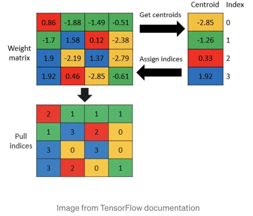 weight clustering 使用权重聚类/共享,降低了存储参数的数量,该方法把一层的参数聚成N个类,并共享索引,举例来说,如果我们把一层聚成8个类,每个参数都会只占 3bit(2^3 = 8)。从实验我们可以看到,使用该方法可以降低模型大小6倍,仅仅降低了0。6%的准确率。我们还可以通过 fine-tune 聚类的中心点,来提升模型精度。