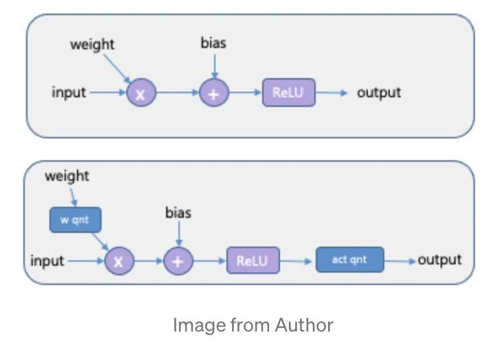 Quantisation Aware Training(QAT)这个方式是在模型训练过程中使用量化,如下图所示,该方法会带来噪声也会影响 loss,所以学到的模型更加鲁棒。