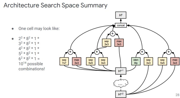 左边是我进行的对应的计算,这样的结构就已经有 10 的 14 次方的 combinations,而神经网络结构搜索的目标就是从这 10 的 14 次方个结果中选出最佳的那个,这显然是一个非常具有挑战性的 Task,这就需要一个好的算法来进行。