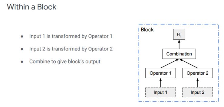 而一个 Block 大概是下图右边的这样一个结构,这是整个网络最小的形成段,Input1 通过 Operator1 transform 一下,Input2 通过 Operator2 transform 一下,二者通过一定方法 Combine 形成一个 Block。