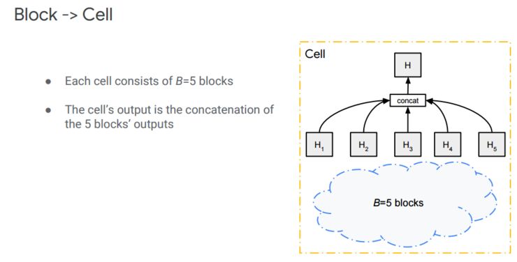 从 Block 到 Cell 的过程,是指一个 Cell 由 5 个 Block 组成,整个 Cell 的 output 是 5 个 Block 的 output 的 concatenation(连接)。如右图,H 代表 Cell 的 output,H1 到 H5 代表了五个 Block 的 output。