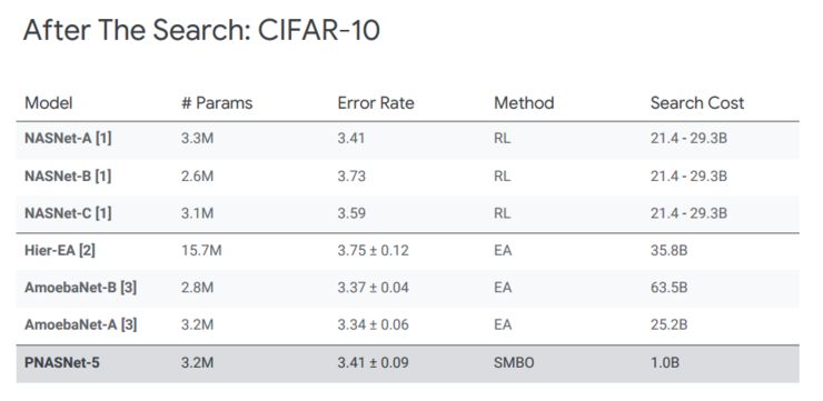 其中 PNASNet-5 是我们最终搜索出来的结果。而我们找到这样一个结构之后,仅仅确保它在过程中的表现好还不够,我们还要在搜索完成后,将 N 和 F 增大,在 CIFAR-10 和 ImageNet 上进行训练和测试。这里的问题是,我们找到的网络结构在最好的 benchmark datasets 上的表现是怎么样的。