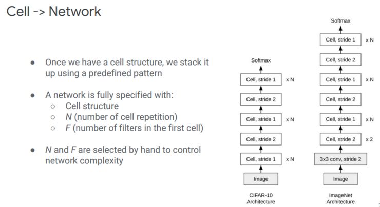 从 Cell 到 Network 的过程,如右图所示,就是有了一个 Cell structure 后,组建整个 Network,整个过程借鉴了 ResNet 的设计。