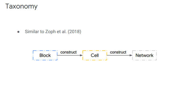 所以我们这项工作的主要目标是尝试把神经网络结构搜索的速度和效率提高,具体的做法是:提出一个创新的算法。在我们描述这个算法前,我们需要了解网络结构搜索空间(Architecture Search Space)。