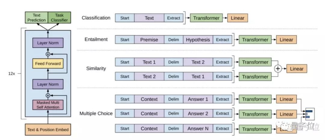 上图左部分,是研究中使用的Transformer架构以及训练目标。右边部分,是针对特定任务进行微调。将所有结构化输入转换为token序列,由预训练模型处理,然后经过线性+softmax层处理。