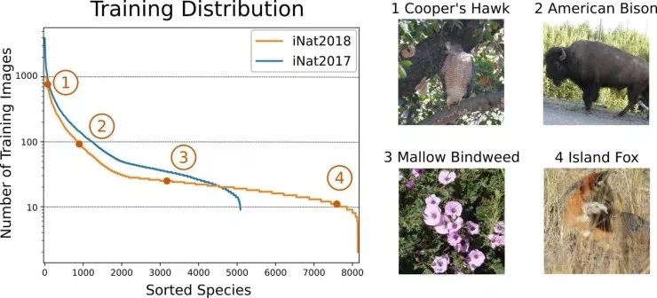与其他图像分类数据集(如 ImageNet)相反,iNaturalist 挑战中的数据集呈现长尾分布,许多种类的图像相对较少。让机器学习模型能够处理长尾类别很重要,因为自然世界严重不平衡 - 有些物种比其他物种更丰富且更容易拍摄。iNaturalist 挑战赛将促进机器学习模型的进步,因为 iNat-2018 的训练分布比 iNat-2017 更长。