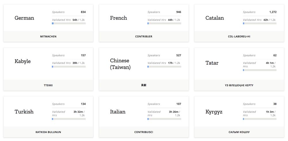 虽然在去年,Mozilla 发布了一个称作 Common Voice 的开源项目,鼓励人们贡献出自己的声音数据,然而大多数人或者并不知道这个项目的存在,或者并不愿意参与其中。下面这张图展示了不同语种上 Common Voice 并不景气的收集进度。