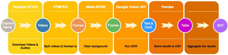 下图展示了包括几个模块的整个数据收集流程的概览。首先我们使用youtube v3 API来搜索下载与指定的电视节目相关的视频,并使用FFMPEG将视频分帧,每一帧用自训练的Mask-RCNN(后面细讲)进行处理以只保留图片的字幕区域。然后将这些处理之后的图片发送给google 视觉API以获取预测的文本和置信度。利用Pandas库,我们将这些结果按照时间戳排序,整合它们为每个视频生成srt文件。下面将向你展示如何实现每一个模块。