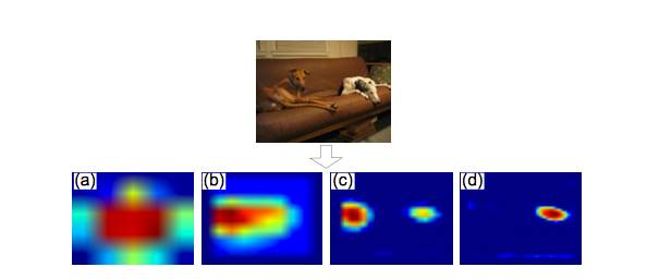 上图是生成自特定图像的 objectness prior。在此例中,沙发表现为(a)和(b),棕色的狗表现为(c),斑点狗表现为(d)。在 objectness prior 的引导下,网络生成了检测结果。
