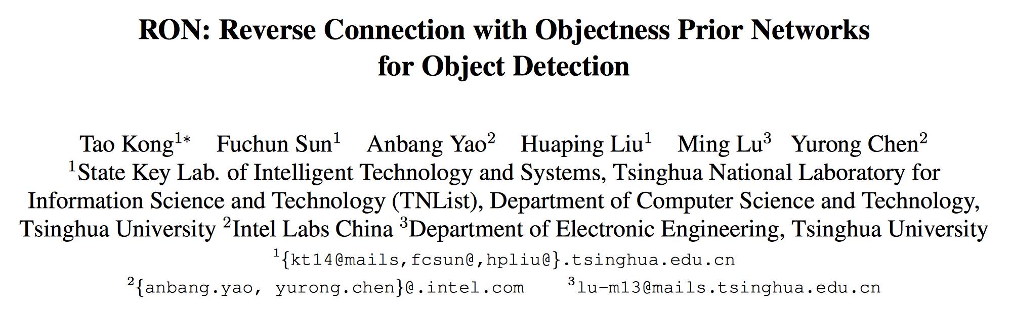 【新智元导读】当前最好的基于深度网络的目标检测框架可以分为两个主要方法流派:基于区域的方法(region-based)和不基于区域(region-free)的方法。两种方法各有优势和劣势。一项由清华大学和英特尔中国研究院的研究者共同参与的研究结合了以上两种方法的优点,提出了一个有效、高效的通用对象检测框架 Ron。研究设计了反向连接,使网络能够检测多层 CNN 中的对象;提出了 objectness prior 来引导目标对象搜索;利用多任务损失函数优化整个网络,这样网络就能直接预测最终检测结果。在测试中,RON 实现了最先进的对象检测性能。论文已经被 CVPR 2017 接收。