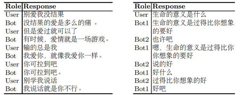 表5. 人机交互示例 (左)和 模型互相交互示例(右)