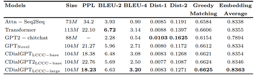 为促进中文对话预训练模型的发展,我们基于LCCC数据集预训练了大规模中文对话生成模型CDial-GPT。该模型的训练过程包含两个阶段,首先,我们在总计5亿字符、包含各类题材的小说数据上训练得到了一个中文小说GPT预训练模型,然后在该模型的基础上,我们使用LCCC中的对话数据继续对模型进行训练,最终得到了中文对话预训练模型CDial-GPT。