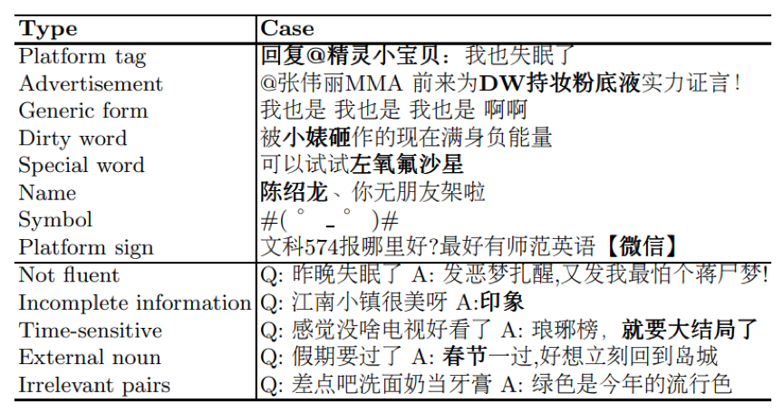 我们同时注意到,来自社交媒体的对话数据中存在各种各样的噪音(表1),为了保证LCCC中对话数据的质量,我们设计了如下数据获取和清洗策略:
