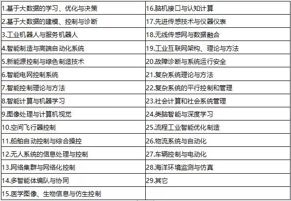 本次大会将设立8个专题、29个征文领域。热忱欢迎全国各高等院校、科研院所和企事业单位中从事自动化、仪器仪表、智能制造、信息与智能科学理论与技术研究的科技工作者积极投稿,特别希望征集能反映各单位研究特色的学术论文。各专题除特邀报告外,将从投稿中遴选优秀论文做专题会场报告。