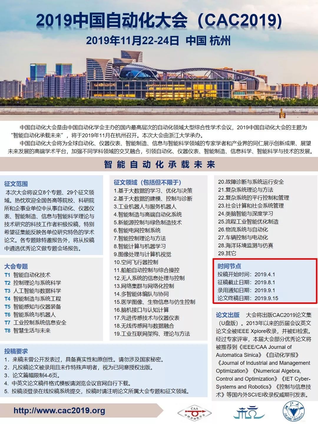 【导读】中国自动化大会是由中国自动化学会主办的国内最高层次的自动化领域大型综合性学术会议,2019中国自动化大会的主题为“智能自动化承载未来”,将于2019年11月22-24日在杭州召开。本次大会由浙江大学承办。应广大作者要求,现征稿截止时间延至2019年8月1日,请各位投稿人周知,欢迎踊跃投稿。
