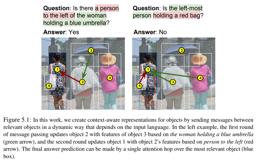 除了模块推理,研究者还提出了使用语言条件图网络(LCGN)构造视觉场景的语境感知表示,以进行关系推理。该模型是基于场景中的视觉实体构建的图网络,并通过实体之间消息传递的多次迭代来收集关系信息。LCGN 通过对图中的边进行加权,动态地确定每一轮从哪些对象收集信息,并通过图发送消息以传播适量的关系信息。其关键思想是根据输入文本的特定语境关系来调整消息传递。