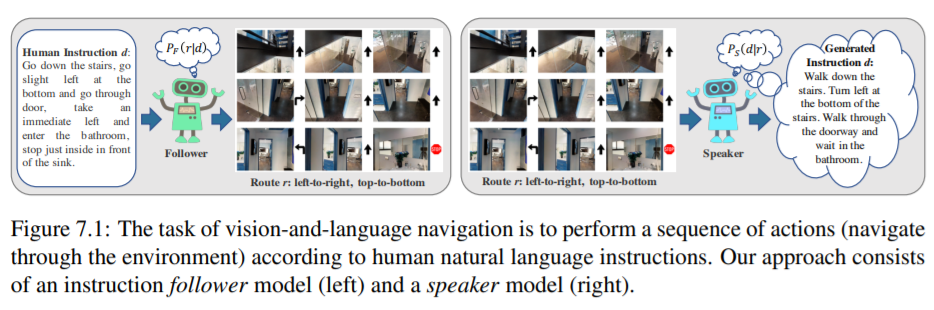 该研究把导航指令跟随任务视为一个轨迹搜索问题,智能体需要根据指令找到环境中的最佳轨迹,从起始位置导航到目标位置。Speaker-Follower 模型包括一个指令理解模块(follower),将指令映射到动作序列;一个指令生成模块(speaker),将动作序列映射到指令(图 7.1),这两个模块均通过标准的序列到序列架构实现。speaker 模块学习为视觉路线提供文本指令,follower 模块则根据提供的文本指令执行路线(预测导航动作)。