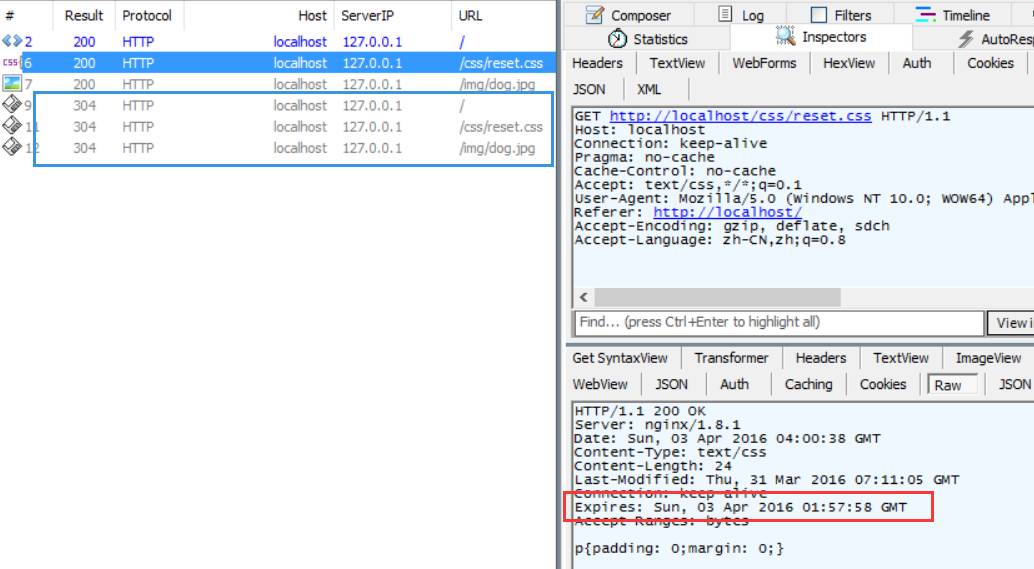 在上图里,缓存时间设置为一个已过期的时间点(见红框),则刷新页面将重新发送请求(见蓝框)。