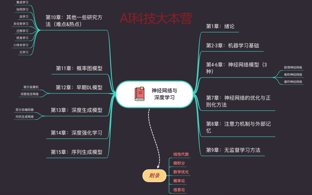 全书正文共分为十五章,附录还有 5 个部分帮助大家补习需要的数学基础知识,AI科技大本营为大家整理了一份全书大纲,希望可以帮助大家最快速度掌握全书的脉络,制定自己的学习计划!相信大家一定会看得开心,有收获!下面就为大家送上这本书的地址,好资源别忘了给邱教授点个 Star!