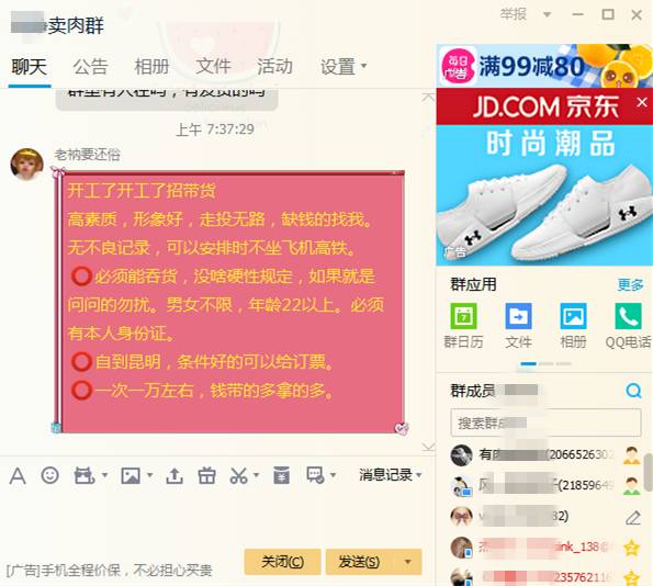 这个聊天群内,不时有人会在群里吆喝自己的“产品”“接受货到付款,速来。”记者甚至见到一位“群友”在群里明目张胆地贴出了运送毒品的“招聘广告”。
