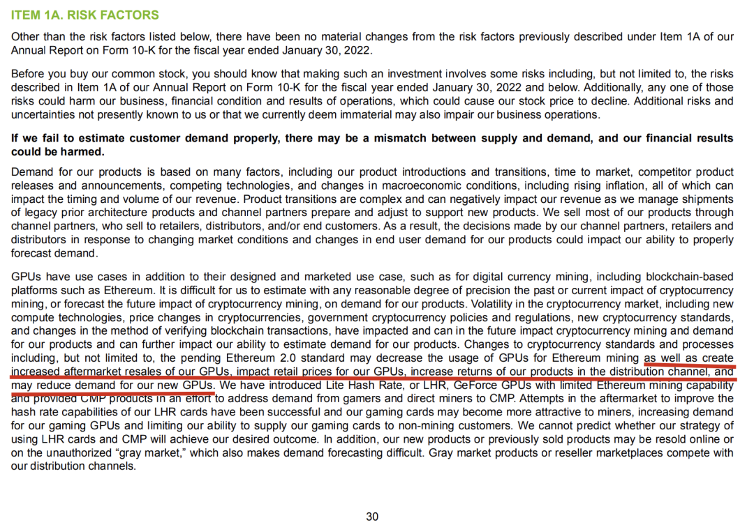 英伟达表示,由于加密货币标准和流程的变更,以及待定的以太坊2.0标准,可能会减少以太坊挖矿GPU的使用,并增加GPU产品的售后转售,影响零售价格,且新GPU的需求也会减少,进而影响未来业绩。