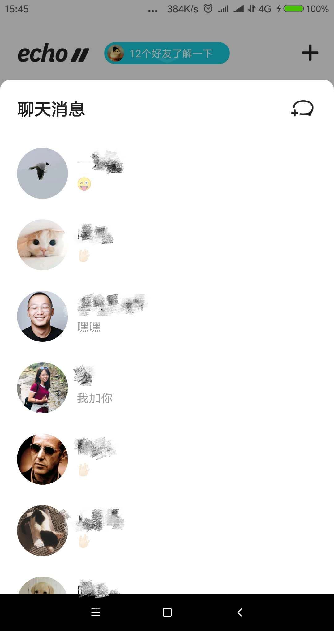 类似的问题还有,当你进入echo的聊天列表,你会发现这个产品没有通讯录,这点很棒,通讯录确实在很多时候是个多余的东西。
