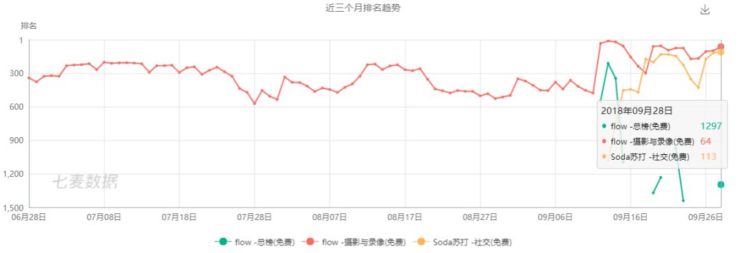 我们依旧来看看增长情况。flow把自己分在摄影与录像的分类中。不过按照我的经验,横向对比摄影榜和社交榜的排名,两者的排名要求其实接近。也就是说摄影榜的64位和社交榜的64位的单日下载量基本差不多。flow大概目前比soda单日新增多个1k不到吧。