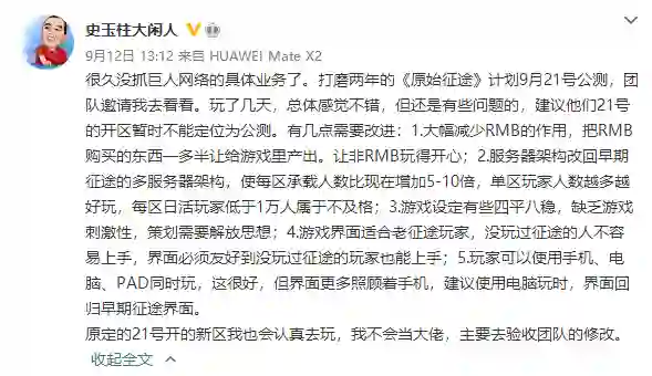 巨人网络昨日表示,董事长、征途创始人史玉柱重返研发一线,对《原始征途》提出多条修改意见。该游戏宣布推迟上线日期,他对该游戏提出了五点具体优化意见,包括大幅减少人民币的作用,把人民币购买的东西一多半让给游戏里产出。让非人民币玩得开心;服务器架构改回早期多服务器架构等。